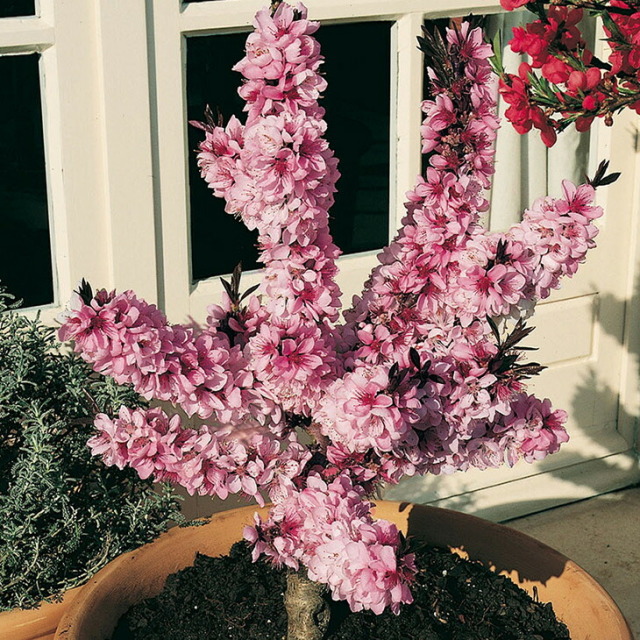 3〜4月頃には、濃いピンク色の八重咲きの花が枝いっぱいに咲き誇り、非常に豪華な印象です。